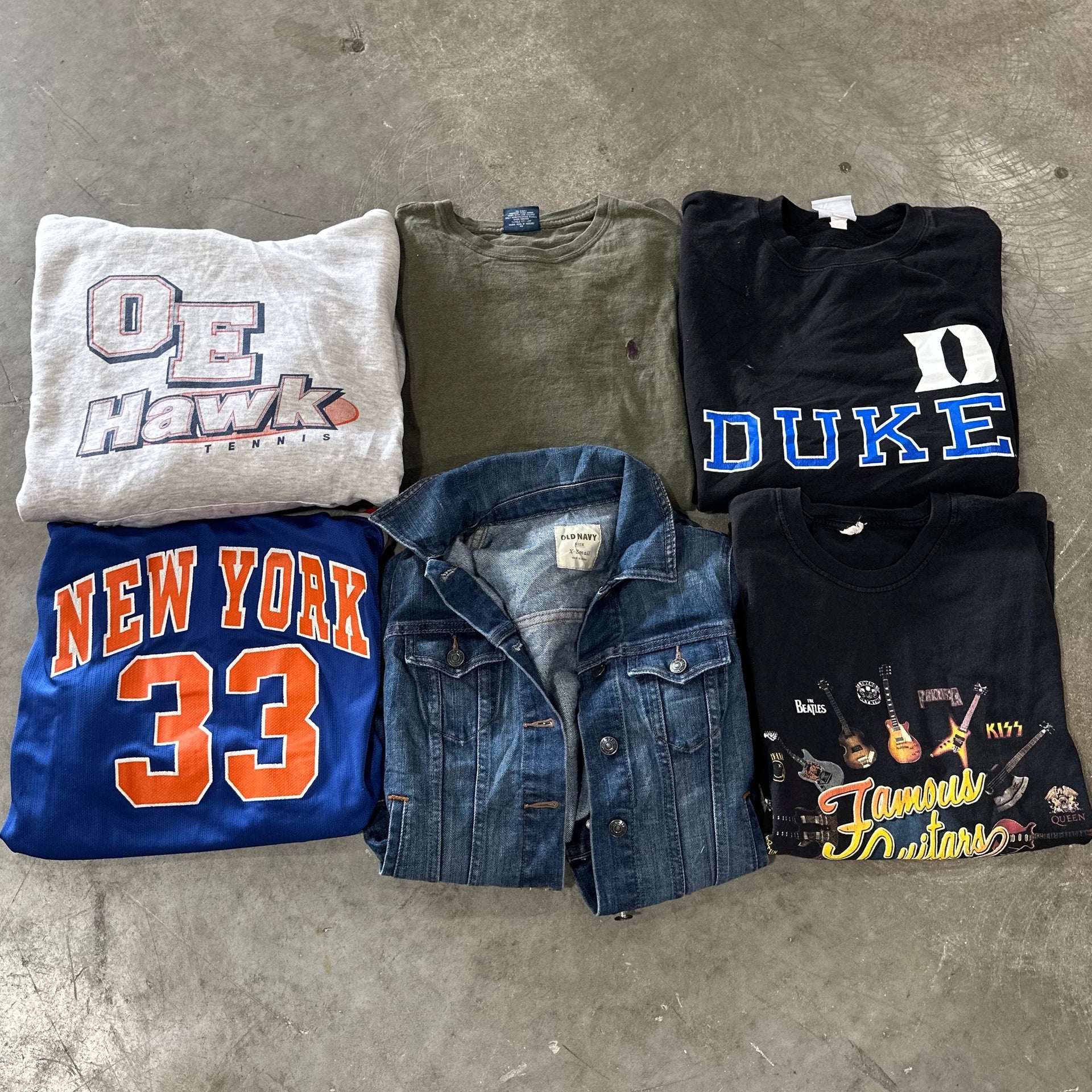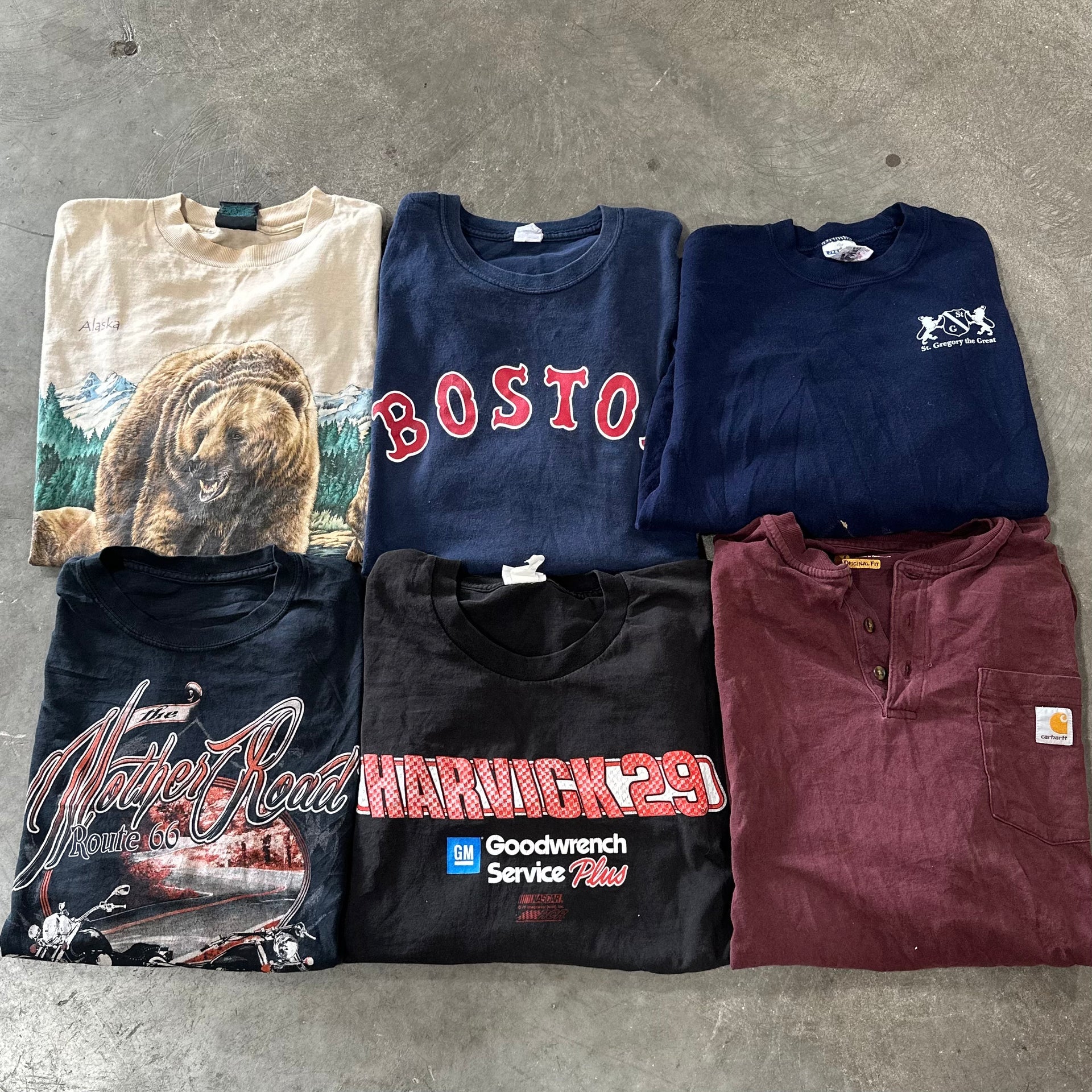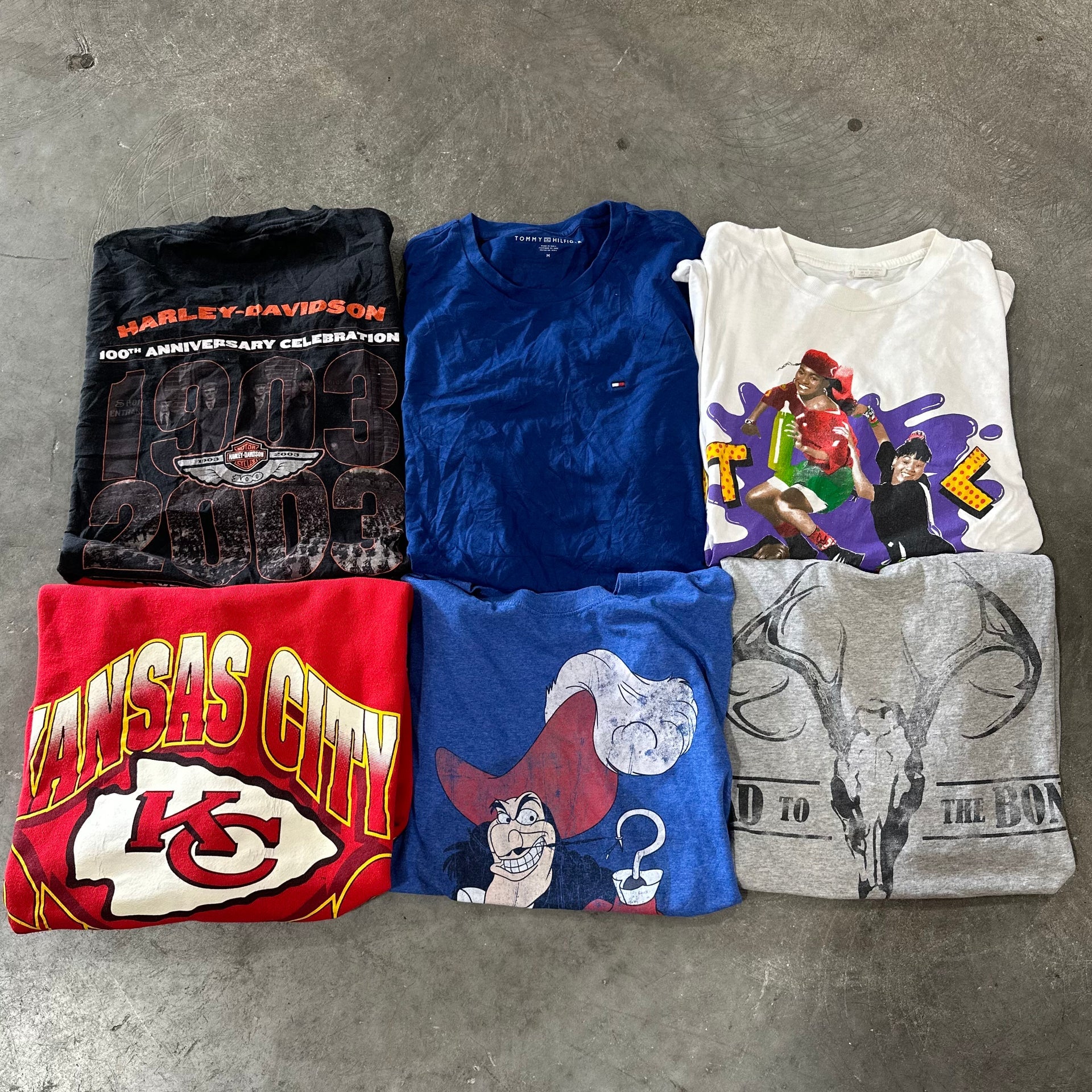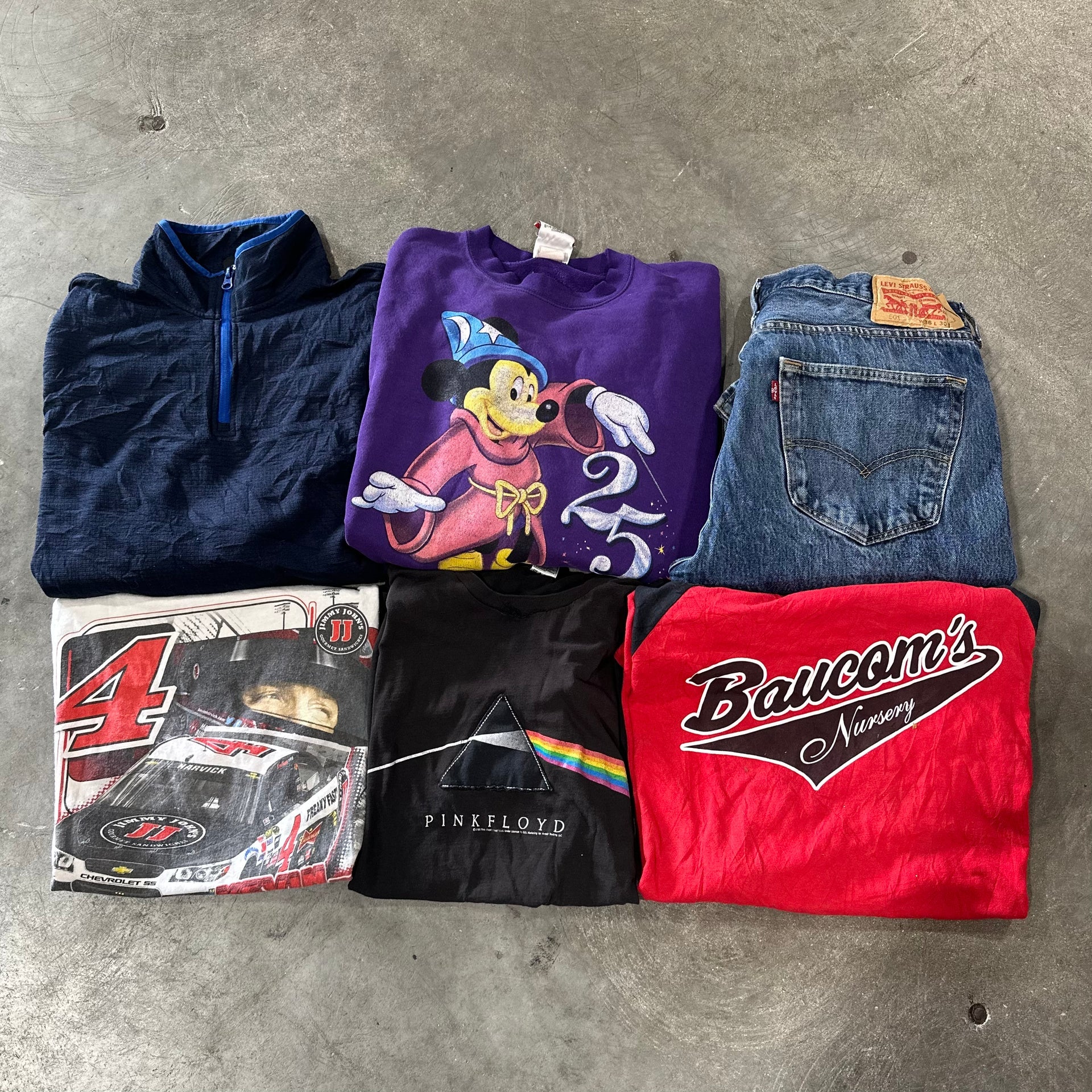 All garment types may be included here: t-shirts, sweatshirts, jackets, pants, etc. Expect some of our best-selling trendy items: Pro Sports, College, Branded, Cartoon, Vintage Graphic, and Levi's. We will also include more desirable trending vintage and modern items such as Harley Davidson, Nascar, Rock/Music, and even some pieces from our premium t-shirt collection.