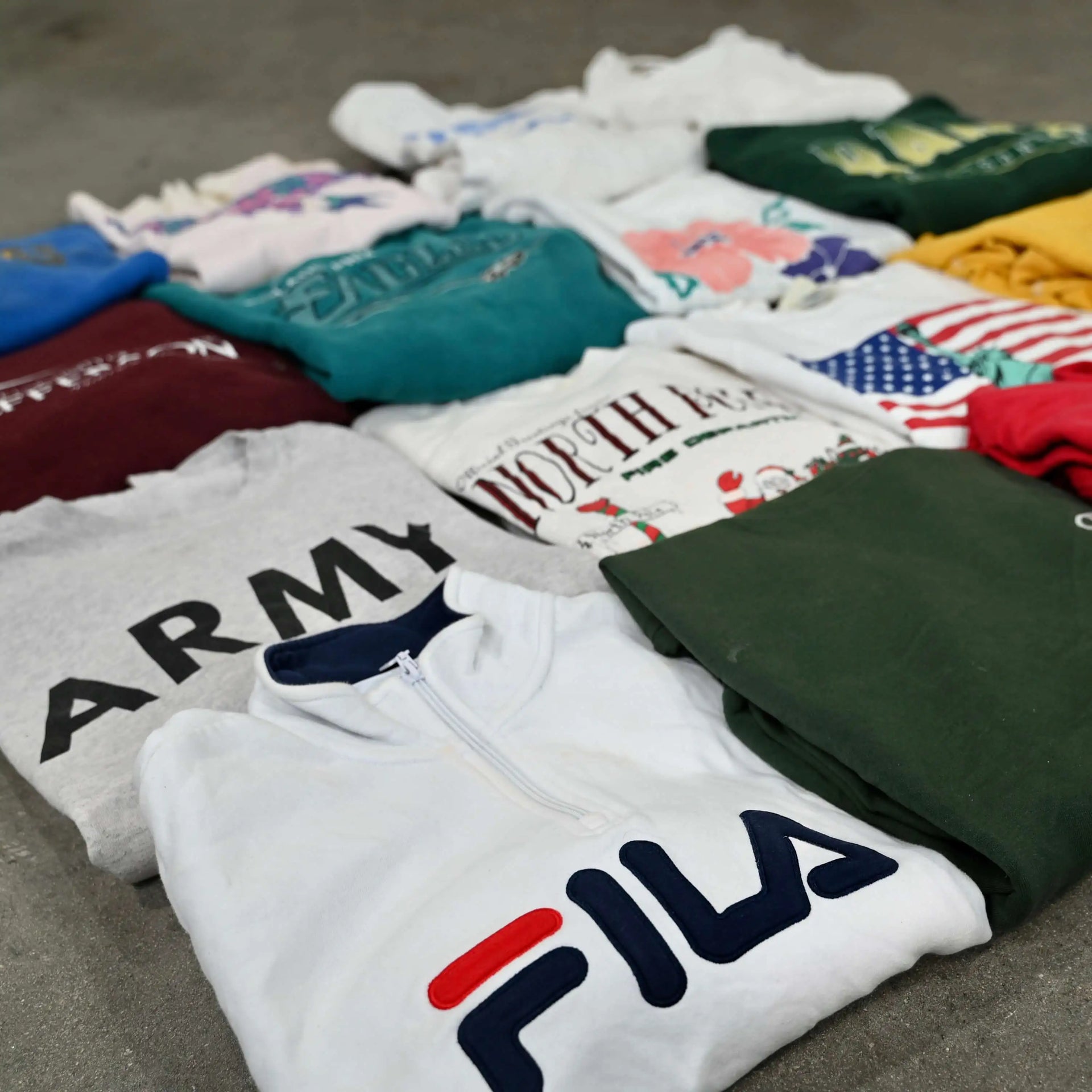 Contains a mix of all categories including Pro Sports, College, Vintage Graphic, Branded, Cartoon, and more. Expect a good mix of everything, most sweats included are crewneck with some hoodies.